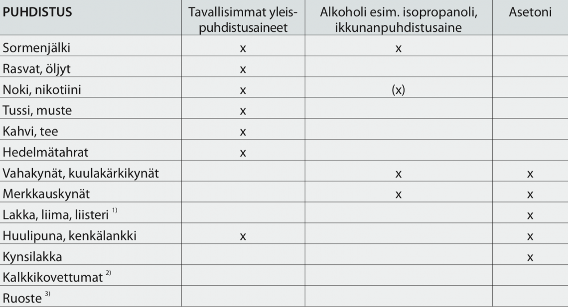Laminaatin puhdistus ja hoito IKI-levyn puhdistukseen tarvittava puhdistusaine valitaan oheisen taulukon perusteella. IKI-levy kestää kaikkia kotitalouksissa tavallisesti käytettyjä, hankausaineettomia puhdistusaineita.